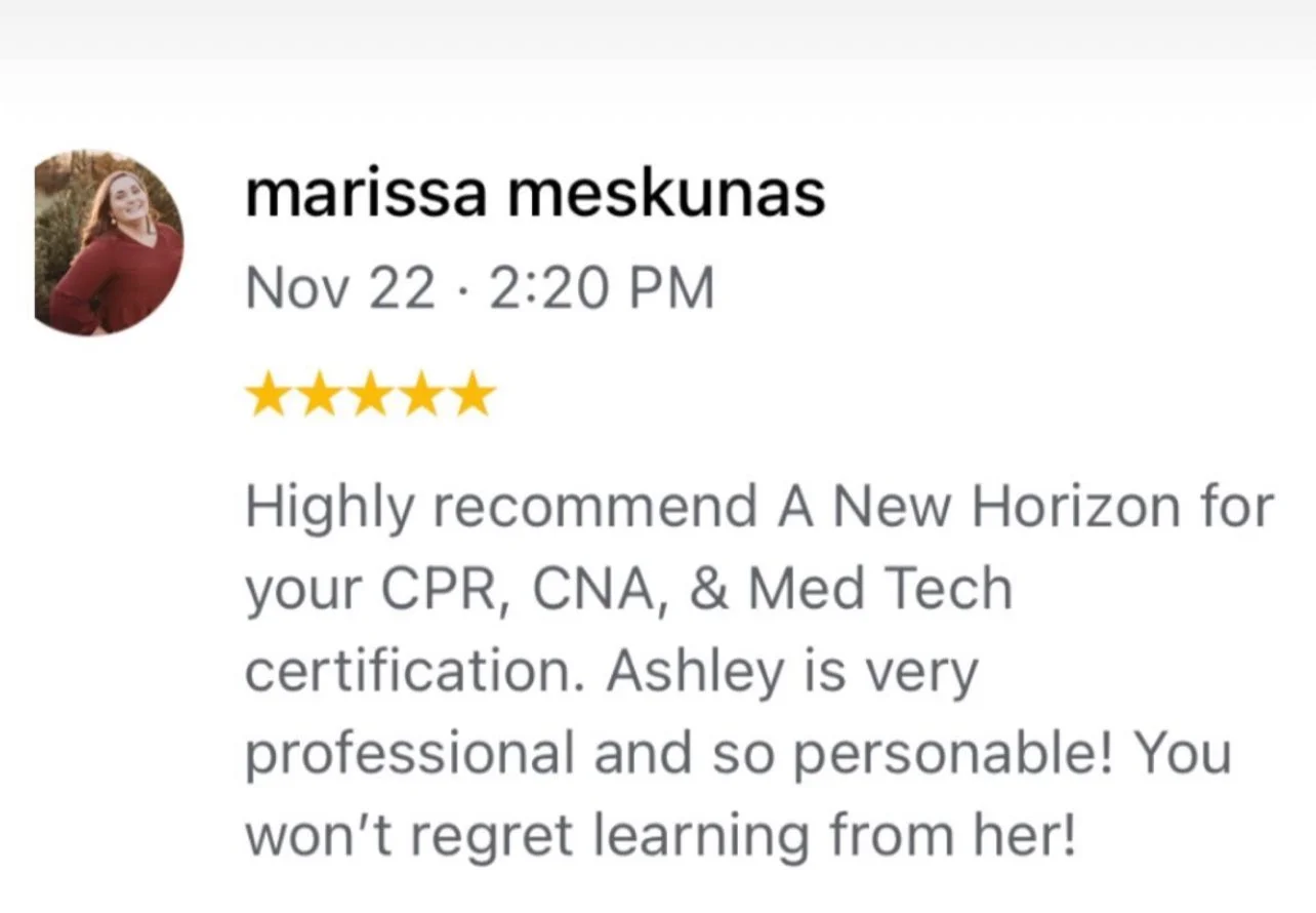 Welcome to A New Horizon your trusted destination for high-quality healthcare training courses. Whether you're starting your journey or advancing your skills for certified nursing assistant med tech or patient care tech, we offer a wide range of certifications, including CPR, First Aid, BLS, ACLS, and more. Designed by experts, our courses combine interactive learning with hands-on practice to prepare you for real-life emergencies. Empower yourself to save lives and excel in your healthcare career today!